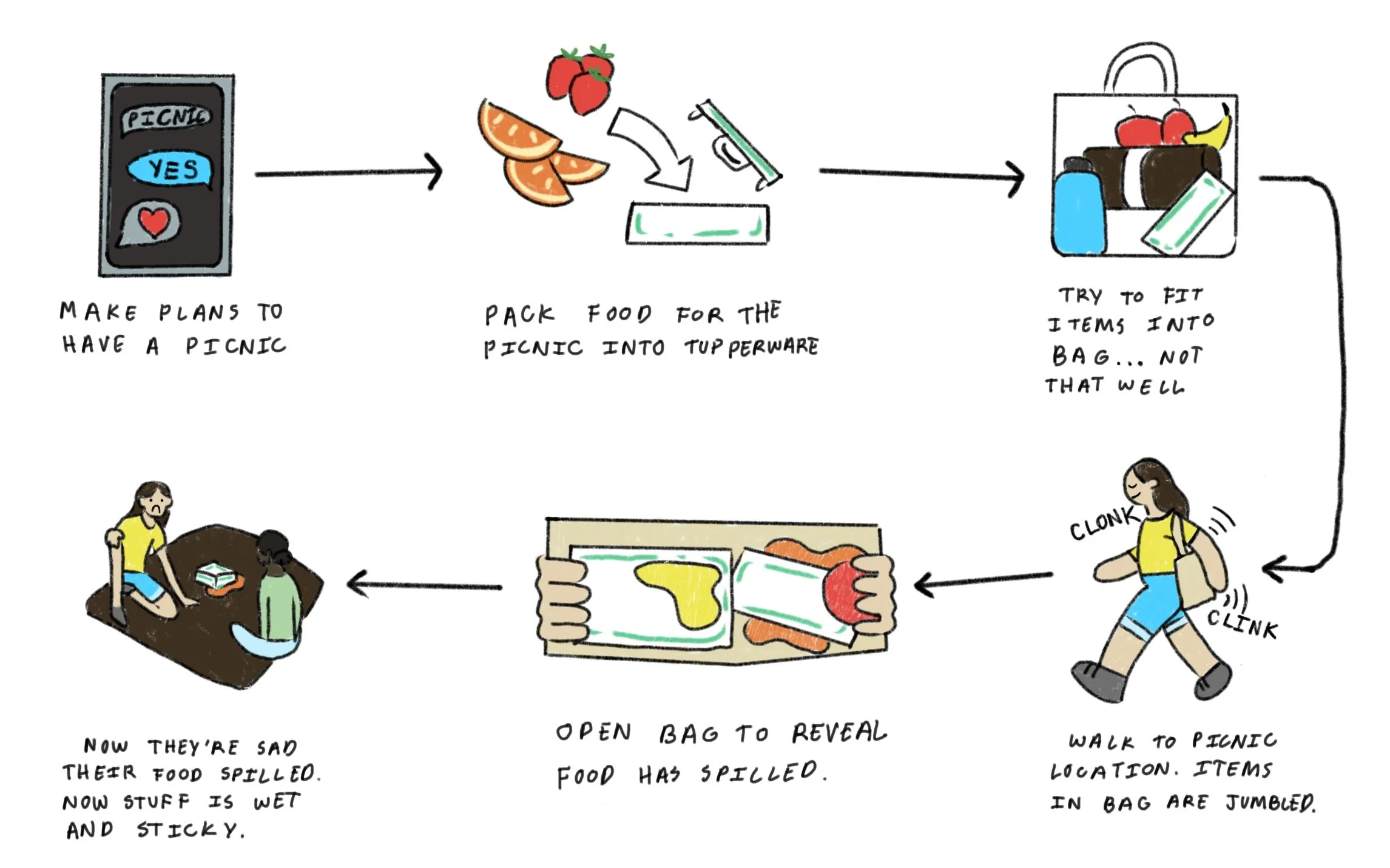 The main painpoints we are targeting are noise from various containers clinking around and making packing various items for your picnic easier. Both items are addressed in the bag Kailey designed with padding and a series of cleverly placed pockets.